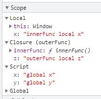 outerFunc 내부에 선언된 변수 z는 지역 변수이고 해당 지역 내부에 innerFunc에서 참조가 가능하다.